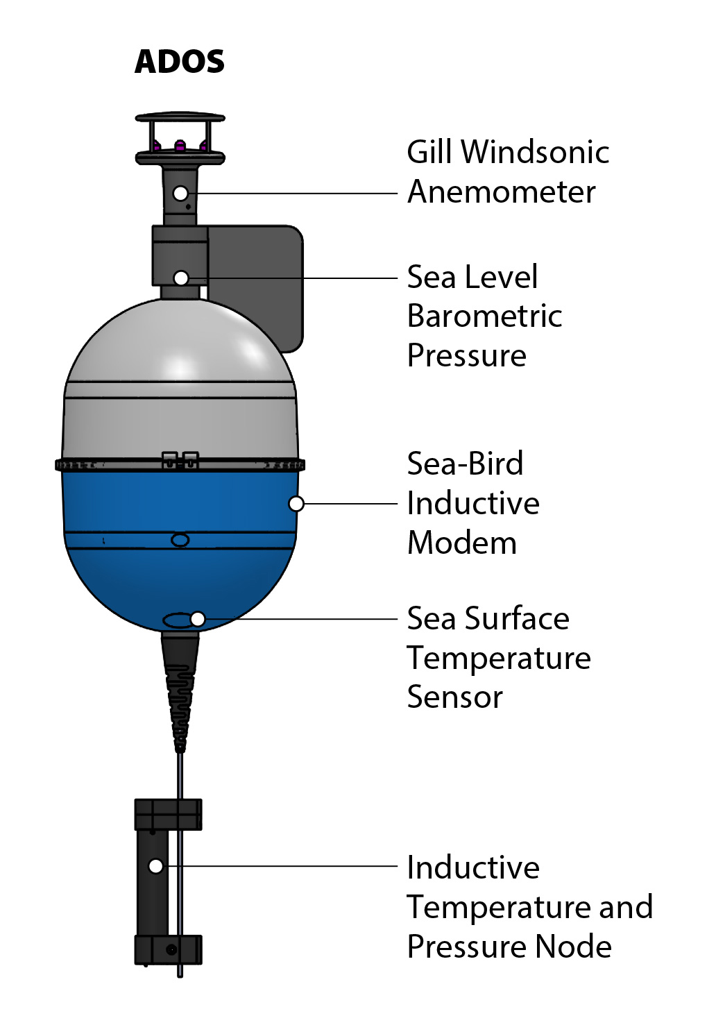 The surface buoy is identical to the one used for the MiniMet (SVPBW) drifter and a 150 m long tether replaces the drogue, thus making the ADOS a non-Lagrangian device.