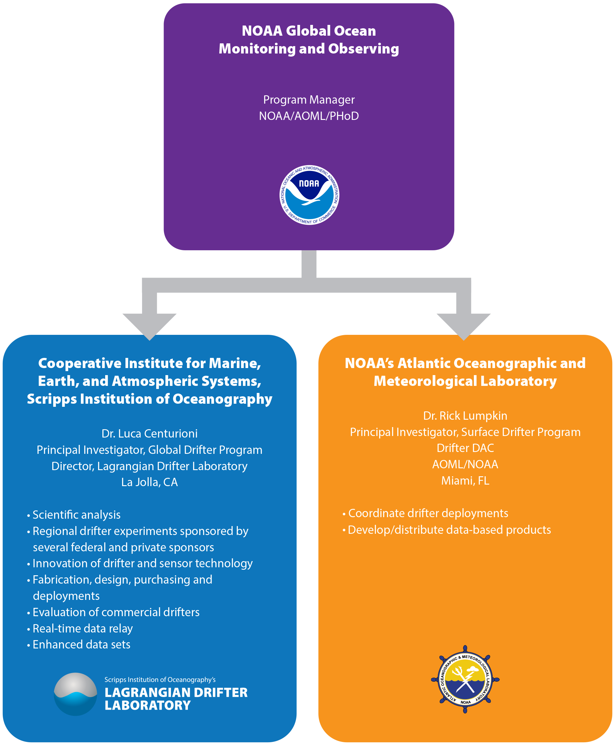 The NOAA Global Drifter Array is implemented through the Global Drifter Program (PI Dr. Luca Centurioni of the Lagrangian Drifter Laboratory at Scripps Institution of Oceanography) and the Surface Drifter Program (PI Dr. Rick Lumpkin of NOAA’s Atlantic Oceanographic and Meteorological Laboratory).