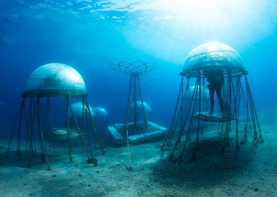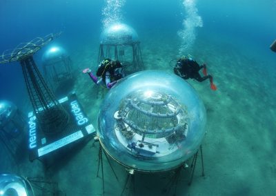 Nemo’s Garden, an under-the-ocean experiment in sustainable agriculture, is testing this futuristic concept by growing herbs such as mint, basil, at thyme inside air-filled clear Plexiglass biospheres at water depths between 4.5 m and 11 m off the coast of Noli, Italy. Solar energy and fresh water obtained by desalinization of seawater is used to maintain conditions optimal for growth. Sensors within the biospheres monitor air and water temperature, illumination, humidity, and carbon dioxide and oxygen levels, and these data are sent to the Nemo’s Garden laboratory.