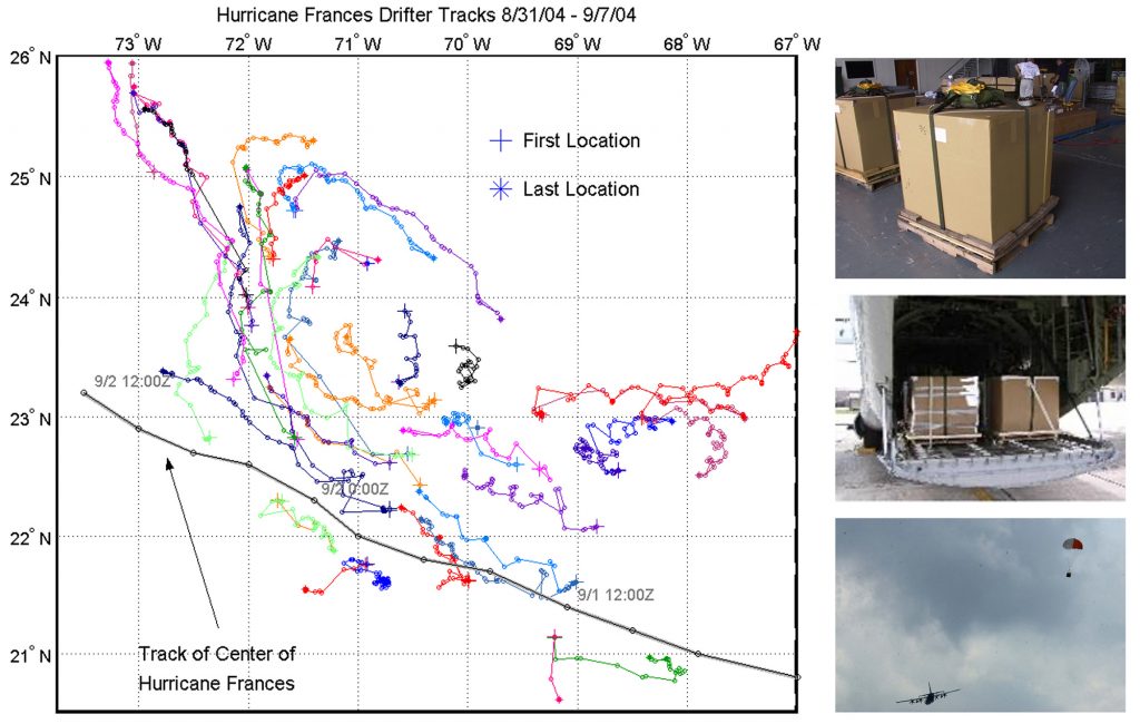 Under the sponsorship of the ONR Coupled Boundary Layer Air-Sea Transfer (CBLAST) program, a multitude of Surface Velocity Program drifters were air-deployed from the US Air Force Weather Reconnaissance C130 aircraft (right panels). These drifters follow the upper water column via the approximately 6 m long holey sock drogue that is centered at 15 m; they also measure sea surface temperature (SST) (see the Educational Tidbits for more explanation). The drifting thermistor chains (ADOS), however, are not designed to follow the ocean currents and instead measure the thermal stratification of the upper ocean in a semi-Lagrangian frame of reference. The drifters are deployed in front of the expected path of the hurricane, and their trajectories, mapped via their positions, show the effects of the hurricane wind field on the ocean currents as well as the surface temperature (left panel). The curves in the trajectories show the inertial rotational response of the ocean currents as well as the entrainment of the surface water along the direction of the hurricane’s track. The protocol for drifter deployment that was established during CBLAST is still used today.