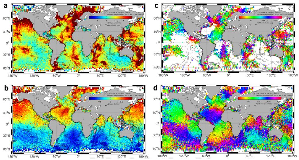 New exciting analyses are emerging by using the inertial and super-inertial velocity information in the global drifter velocity data set. Velocity data from drifters are used to compute tides. The four panels show the M2 tidal velocity, which contains both barotropic and baroclinic tidal components where the (a) mean amplitude, (b) rotary coefficient, (c) inclination, and (d) Greenwich phase of M2 tidal currents are averaged in 2º x 2º bins. Note that amplitudes in excess of 5 cm/s are saturated. For the inclination, bins with small (semi-major axis <3 cm/s), and near-circular (rotary coefficient larger than 0.9 in absolute value) tidal currents are also excluded.