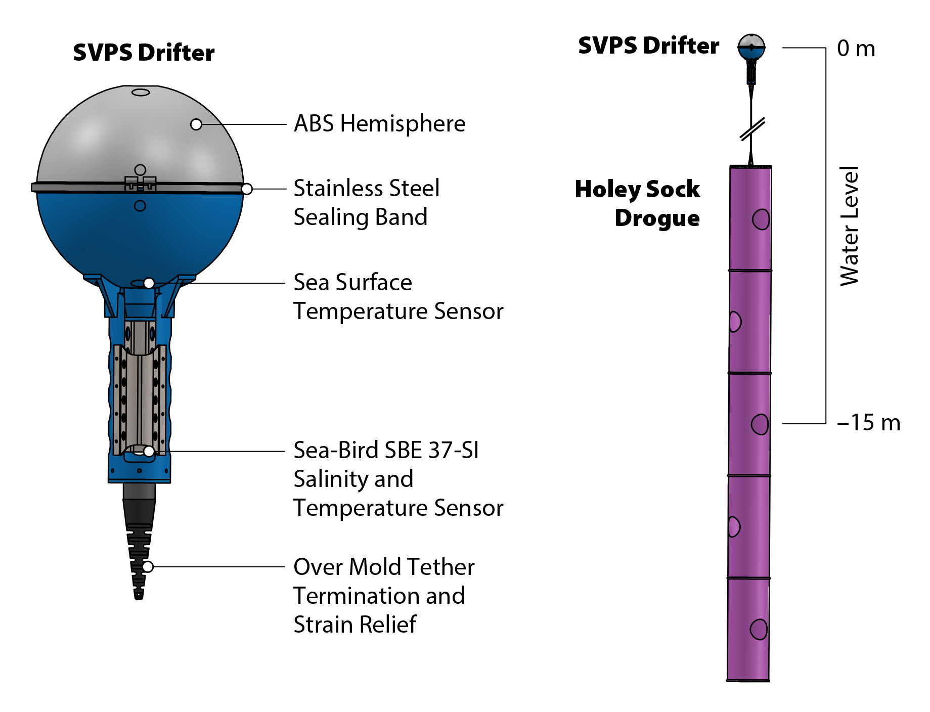 The SVP Salinity (SVPS) drifter (Centurioni et al., 2015; Hormann et al., 2014a) stems from the SVP Drifter design and can also be configured with a barometer. It carries a Sea-Bird Electronics SBE37 sensor.